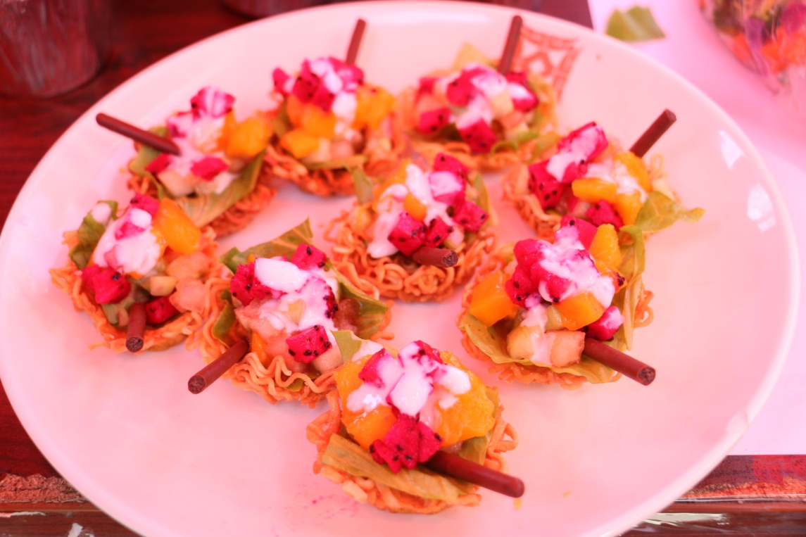 这次比赛参与评分的共有9个产品,最后由丁克芳女士宣布晋级的6个产品,分别是名为“妙脆筒”、“咖喱黄金脆脆饼”、“怡口伊面”、“日出”、“刚刚好”、“不良寿司面”的创新产品。并呼吁同学们尝试做出不一样的方便面,发挥创意。