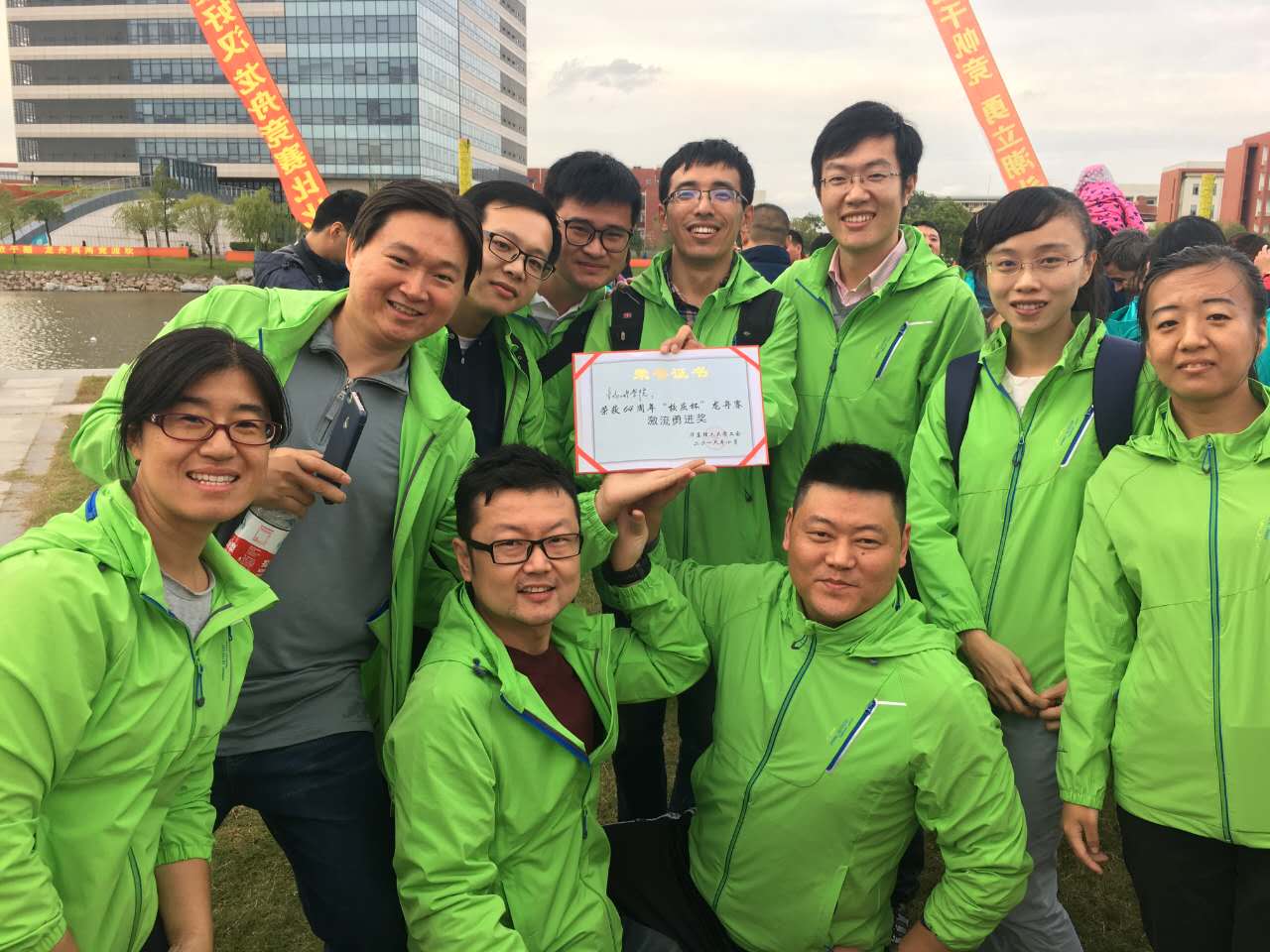 队格外亮眼,清一色的苹果绿上衣,在蓝天白云红叶的衬托下异常醒目,生工队伍一出场,就赢得了大家的阵阵掌声。本届龙舟赛中出现了几个新面孔,最引入瞩目的是王善利老师,虽然年龄是年轻队友的近一倍,但力气一点不比年轻队友差。