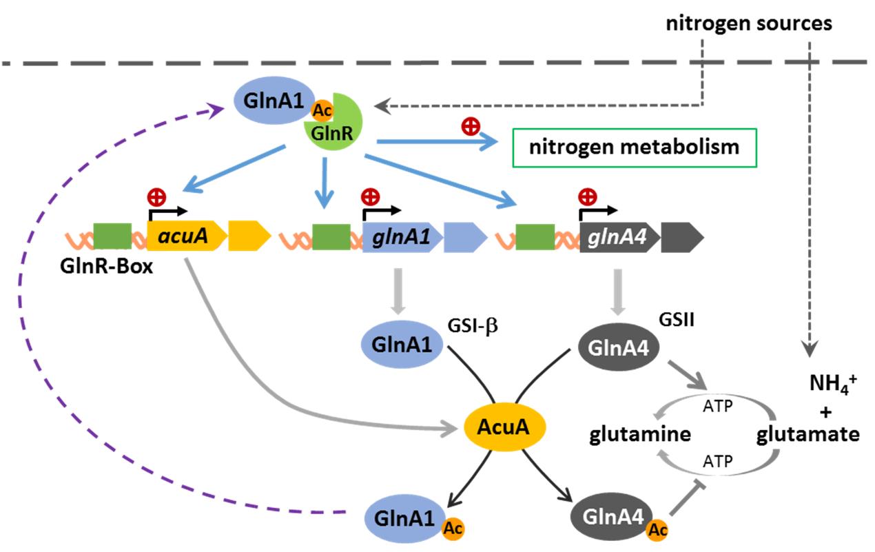 谷氨酰胺合成酶GlnA1是放线菌氮代谢的关键酶,是结核杆菌的毒力因子及药物靶点。课题组首次发现了赖氨酸乙酰化修饰对两种放线菌谷氨酰胺合成酶GSII型及GSI-Beta型具有完全不同的效应:乙酰化抑制了GSII型谷氨酰胺合成酶活性,而乙酰化赋予了GSI-Beta型谷氨酰胺合成酶分子伴侣的调控功能,通过蛋白质-蛋白质相互作用,促进了氮调控因子GlnR 与DNA的结合能力及转录活性 (10)。另一方面,GlnR调控谷氨酰胺合成酶基因转录及谷氨酰胺合成酶乙酰化水平(乙酰转移酶AcuA介导)以响应细胞内可利用氮源的变化。进一步研究发现,这种转录及翻译后修饰氮代谢反馈调控机制(GlnR-PTM-GlnA)在放线菌中是高度保守的,这些发现为工业微生物代谢调控途径的菌种改造及发酵工艺优化提供了理论基础及新策略,也为结核分枝杆菌等致病菌的新药开发提供了新的靶点。