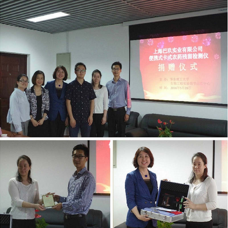 5月26日下午,上海巴玖实业有限公司便携式卡式农药残留检测仪捐赠仪式,在奉贤校区实验七楼613室举行。上海巴玖实业有限公司经理张鹏、李翠平,上海市慈善基金会募捐部副部长陈晓菲、处置部副部长陆双龙,啪啪网