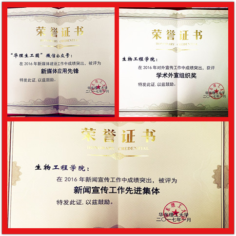 1月10日,2016年信息宣传工作总结表彰会在办公大楼第二会议室举办。在本次总结表彰会上,我院获得“新闻宣传工作先进集体”、“新媒体应用先锋”和“学术外宣组织奖”,张元兴、谭文松、刘少伟3位同志荣获“华笙奖”,占全校5个“华笙奖”名额中的3个,李阳被评为“新闻宣传工作先进个人”、肖婧凡、富琳桦获得“优秀通讯员”称号,阳大海的文章《免疫学顶级杂志Immunity报道华理感染免疫学研究新进展》获得“好新闻”二等奖,还有9位教师获得“学术外宣奖”。