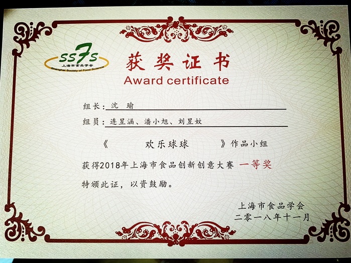 参赛选手沈瑜、连昱涵、潘小旭、刘昱妏的作品“欢乐球球”荣获一等奖。上海市食品学会理事长潘迎捷、副理事长王锡昌,副秘书长周家春教授及清美左龙武副总经理等出席颁奖典礼并为获奖选手颁奖。