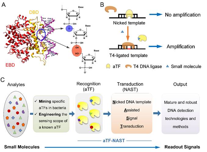 微生物是认知生命活动规律的重要源头,也是合成生物学实现“格物致知”到“建物致知”再到“建物致用”所需要的具有特定功能的生物“元/器件”的重要发掘对象。华东理工大学生物反应器工程国家重点实验室张立新教授带领的团队首次发现別构转录因子(allosteric transcription factor,aTF)在体外能够结合缺刻的DNA结合序列,并进一步利用这一发现建立全新的小分子检测方法。相关工作于11月28日以长文(Research Article)的形式发表在Science子刊Science Advances。文章链接://advances.sciencemag.org/content/4/11/eaau4602