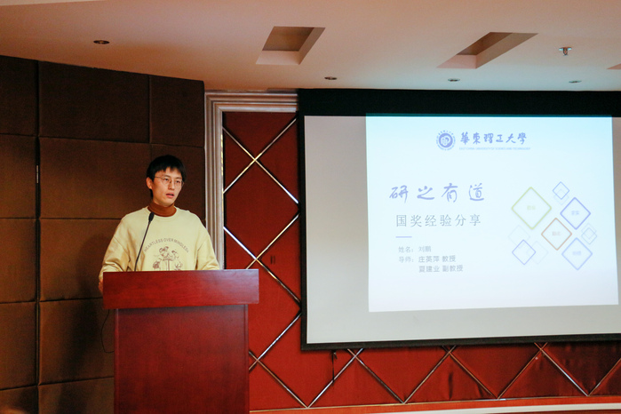 随后给我们带来精彩分享的是刘鹏同学。攻读博士学位期间,他曾获学业奖学金一等奖、金鑫奖学金等;并且积极参加课外创新实践活动,荣获“蔚蓝生物杯”科技创新竞赛特等奖、第十三届“华陆科技·奋进杯”科技作品竞赛特等奖;组建创业团队参加第五届中国“互联网+”大学生创新创业大赛,凭借项目“‘简测’——快速取样装置和检测助剂”一路过关斩将,先后获得校特等奖、上海市银奖、全国铜奖。