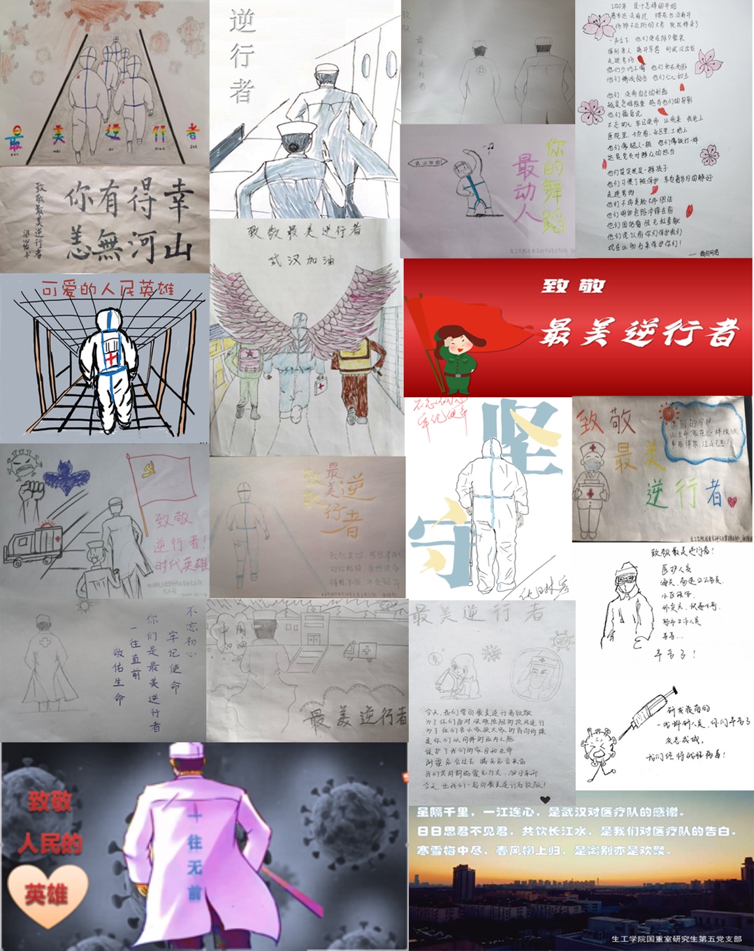 党支部开展“致敬最美逆行者”活动,全体成员采用多种的形式向这些为疫情而奋斗的逆行者们致以崇高的敬意。是他们挽狂澜于既倒,扶大厦之将倾。无数仁人志士冲向战“疫”的一线,他们用行动向所有人展示了他们勇担重担、不惧风雨的高贵品格。正是有他们的舍生忘死,英勇奋战,才会有山河无恙,国人平安。