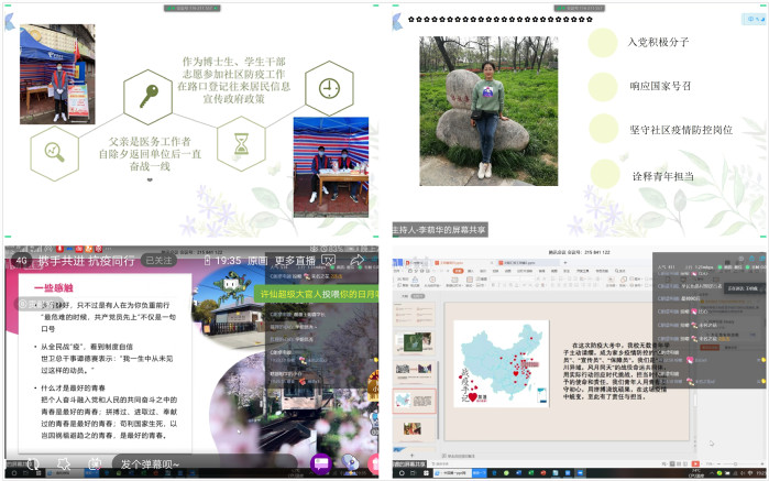 积极组建青年战“疫”讲师团,分别开展了两场以“志道弘毅,砥砺前行”和“青春战‘疫’,聚力前行”为主题的战“疫”宣讲活动,讲师团成员从不同角度分享自己战“疫”的志愿经历与感受。19级秋博班邹振平同学的父亲作为医护工作者冲在一线,除夕夜都没吃上一口饺子,他本人也在父亲的感召下,积极加入当地抗“疫”志愿队伍;生技172班解晨笛同学分享了自己勇敢加入志愿者队伍,宣传防疫知识,守卫社区邻里健康的感人故事;19级生工专硕班王明睿同学讲述了帮助村民采购物品、守护村口安全的志愿经历,并提出作为青年人应该用青春坚守初心,用拼搏浇筑硕果;食工182班靖睿同学分享了帮助当地店铺复工复产的志愿工作,在她的眼里,最好的青春莫过于把个人奋斗融入祖国建设,经历过拼搏、进取、奉献,才是青春最亮的底色。