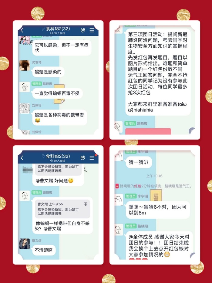 各团支部发挥专业特色,开展了创意满满、形式多样的线上团日活动。生科172班发挥专业力量,组织班级同学云上抗“疫”,分享分析新冠病毒相关专业文献,形成近34000的调研报告;食科182班进行“云”升旗、“云”宣誓等活动,敬意汇于屏幕,誓言铮铮有力;生物196班组织支部同学学习习近平总书记系列重要讲话,坚定中国特色社会主义制度自信……,本次主题团日活动内容丰富,充分彰显了团员青年先进性,绽放着青春的夺目光彩。