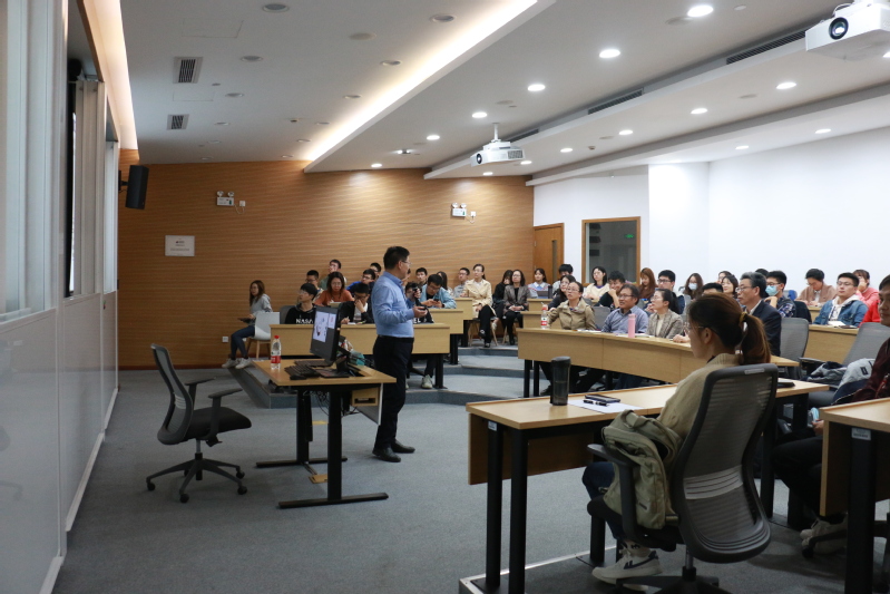 讲座中,袁其朋从存在的能源不足与环境污染等问题引入,简要介绍了目前医药、化工行业中合成生物学从实验室走向工业应用的过程中面临的诸多挑战,随后就他们课题组在关键酶改造、碳源协同利用、混菌培养体系设计等方面取得的研究进展进行了分享。许建和教授对袁教授百忙之中前来向我院师生分享其研究成果表示感谢。