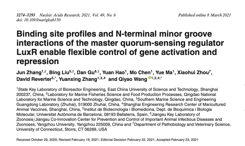 人与人之间可以通过语言、表情和动作进行交流。细菌菌体之间也能进行互相交流通讯,实现细菌的“社会性”行为,实现它们的共同目标,包括生物被膜、生物发光、运动性、营养代谢、毒力调节和环境适应性等。这种菌群交流通讯的机制称为群体感应 (Quorum sensing, QS) 系统。在海洋弧菌中存在复杂的群体感应系统,介导进行细菌种内和种间、细菌-藻类、细菌-动物宿主等多种信号交流机制,最终通过TetR家族的中枢调控元件LuxR蛋白同步控制下游多达600多个QS基因的表达,产生菌群行为。人们对LuxR蛋白同时调控诸多基因表达的机制一直不清楚。4月6日,国际知名的生化与分子生物学学术期刊Nucleic Acids Research发表了啪啪网