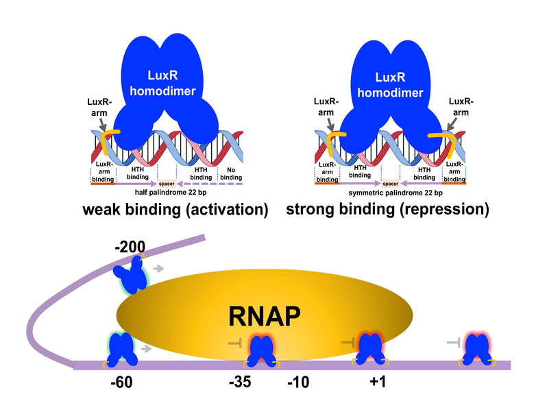 该研究通过多种高通量测序技术,系统鉴定了鱼类病原菌溶藻弧菌受LuxR调控的基因,发现LuxR蛋白识别并结合具有回文对称性和半回文对称性的DNA片段。受LuxR激活或抑制基因的启动子在结合位点的序列、数量及分布模式方面有显著不同特征。该研究首次解析了LuxR-DNA复合物结构,发现除了螺旋-转角-螺旋结构域介导的互作,LuxR的N-末端结构域与结合位点两端的小沟互作。该研究揭示了LuxR与激活型和抑制型DNA不同的结合机制,阐明了弧菌能实现交流通讯、产生群体行为的分子基础。该研究成果为设计QS抑制剂以及新型病害防控策略的研究打下良好基础。