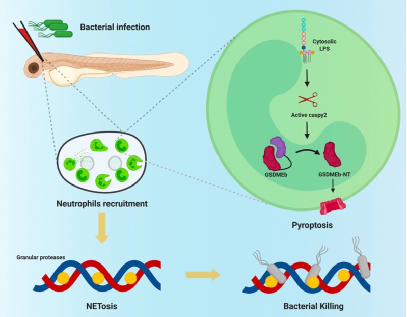传统认为,中性粒细胞可通过形成NETs对抗外源入侵的病原体。NETs是以核内或线粒体内DNA为骨架,负载弹性蛋白酶和水解酶等组成的网状结构,在诱捕和杀灭病原过程中发挥积极效应。阳大海副教授课题组充分利用斑马鱼模型可视化、易于基因编辑等特点,建立了杀鱼爱德华氏菌(Edwardsiella piscicida)感染中性粒细胞转基因斑马鱼模型,发现中性粒细胞可以快速迁移至感染部位并发生焦亡。研究人员通过深入研究,依托斑马鱼活体基因编辑技术,阐明了Caspy2-GSDMEb信号介导的焦亡效应是导致中性粒细胞NETs发生的关键。采用中性粒细胞选择性清除、DNA酶、焦亡相关基因敲除等多种方法和手段,研究人员进一步证实了NETs产生是宿主抵御病原感染的关键。该研究成果从活体感染层面解析了硬骨鱼细胞焦亡信号介导中性粒细胞NETs发生这一关键分子机制,为深入研究病原与宿主先天免疫细胞互作分子机制提供了新方向,也为抗感染药物的研发提供了更好的活体模型。