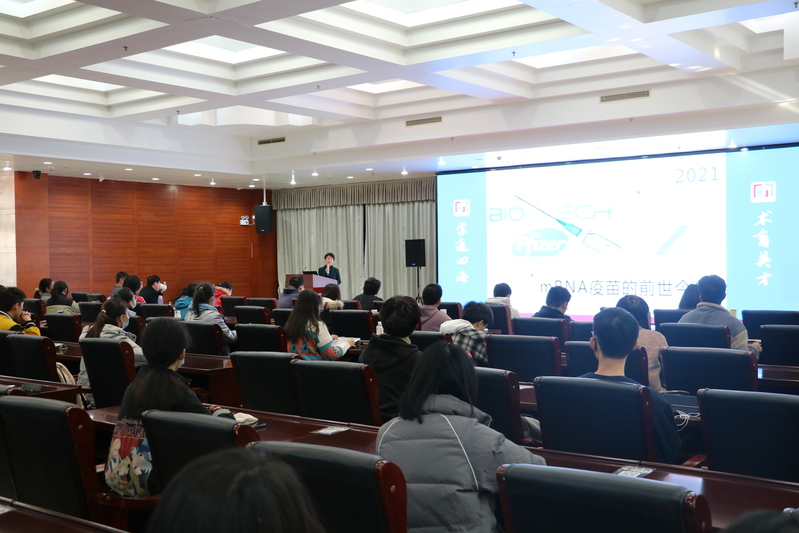 在本期“通海讲堂”中,刘琴以“mRNA疫苗的前世今生”为题,用生动的语言将学术前沿与科学普及相结合,带领学生一起了解mRNA疫苗的发展历程和国内外研究的前沿动态。