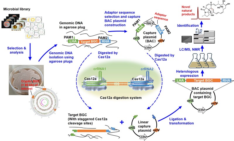 在放线菌大型基因簇捕捉和沉默基因簇激活发掘新颖活性天然产物研究中取得的最新进展。研究论文标题为“Activating crypticbiosynthetic gene cluster through a CRISPR-Cas12a mediated direct cloningapproach”。