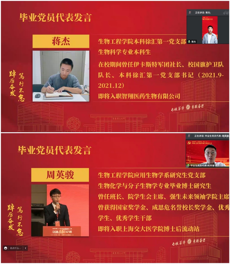 本科毕业生党员代表蒋杰分享了作为志愿者参与到疫情防控一线工作的经历。他表示,作为一名退伍军人和共产党员,自己始终不忘初心、牢记使命,越是艰难,共产党员越要顶住压力,迎难而上,在祖国和人民最需要的时候,彰显共产党员的责任和担当。研究生毕业生党员代表周英骏向啪啪网