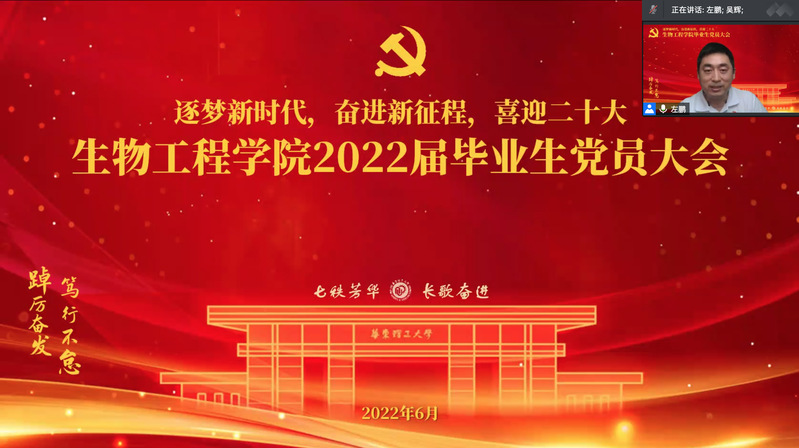 吴辉以“踔厉奋发、笃行不怠”为题,为2022届毕业生党员上最后一堂党课。他向毕业生党员提出四点要求。一是要不忘初心。共产党员一定要坚定理想信念,厚植家国情怀,永葆党员本色。二是要牢记使命。作为青年党员要练就过硬本领担当时代重任,为中国人民谋幸福、为中华民族谋复兴。三是要勇于担当。他以疫情期间涌现的优秀党员志愿者为例,鼓励同学们知责于心、担责于身、履责于行,在担当作为中传承华理基因,弘扬生工抗生素精神。四是要奋勇拼搏。不负韶华,高扬理想风帆!