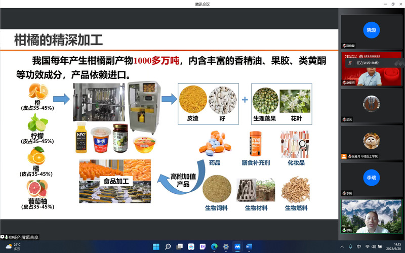 院长单杨院士在线出席了华东理工大学70周年校庆报告活动暨第二十六期俊棠论坛。单杨院长作了题为“柑橘功能性成分的营养与健康”的学术报告,报告会由科学技术发展研究院院长赵黎明教授主持,生物反应器工程国家重点实验室主任张立新教授等近300名校内外师生在线聆听了报告。