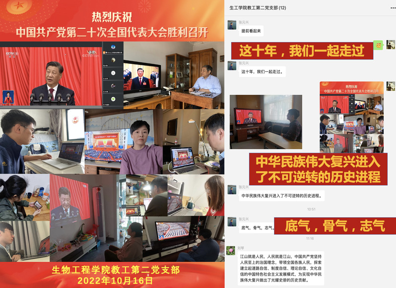 国家重点实验室研究生第五党支部朱良靓:还不到十点,支部党员们就早早地打开直播,等着党的二十大这一盛会的开幕。等待过程中大家回顾了这十年的变化,从高铁到电子产品,从教育到环境,大到国家小到自己。在庄严的国歌声中党的二十大正式开幕,习近平总书记对过去五年工作和十年变革做了全方位的总结。作为在新时代成长起来的新青年,我们感同身受,总书记报告里的内容我们都能在生活点滴小事中找到映射和体现。新的时代已然到来,新的征程已然开启,作为党员和青年科研工作者的我们也被赋予了新的使命,在祖国、社会和学校的培养下,成长为拔尖创新人才,以国家战略需求为导向,“国家哪里有需要,我们就去哪里做贡献”,努力为党和人民事业发展做贡献,青春之微光汇聚迸射夺目光彩!