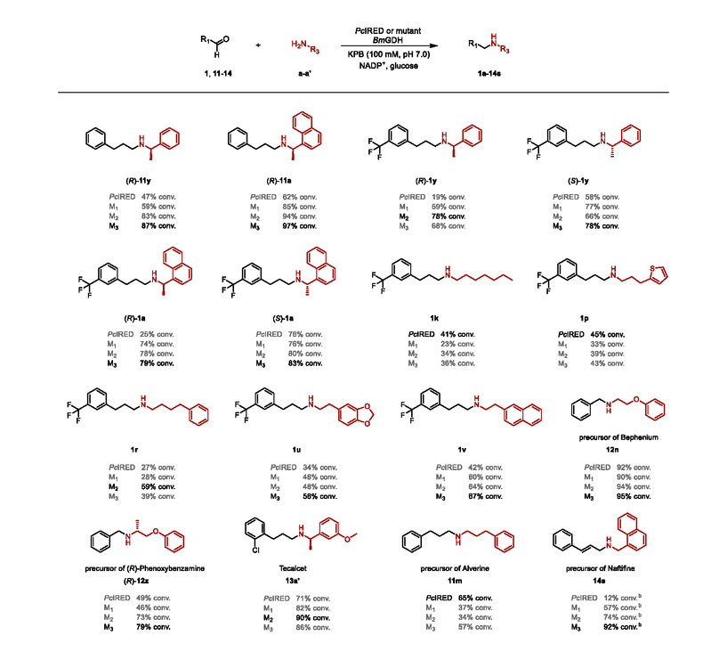 该研究小组以甲状旁腺功能亢进治疗药物西他卡塞的合成前体大位阻的间三氟甲基苯丙醛和(R)-1-(1-萘基)乙胺为模式底物,对不同来源的天然亚胺还原酶进行筛选,鉴定出了一类来源于卡门柏青霉菌的特殊亚胺还原酶,该分支上的酶催化剂可以直接催化大位阻的间三氟甲基苯丙醛和(R)-1-(1-萘基)乙胺合成西他卡塞,且发现该酶更加偏好于利用大位阻的胺作为亲和试剂催化羰基的还原胺化,展现出了独特的底物特异性。为了进一步提升其催化性能,该团队也利用计算机辅助的蛋白结构分析,确定可能影响酶活性的关键氨基酸位点,通过多轮的酶分子改造,获得的最优突变酶活力提升了488倍,Tm提升了约10°C。利用获得的突变酶作为催化剂,实现了多种羰基底物与各种大位阻胺供体之间的还原胺化,包括西那卡塞、酚苄明、苄酚宁、阿尔维林等药物分子/药物前体在内的大位阻胺类化合物,转化率高达99%以上,同时表现出较佳的立体选择性(cis/trans选择性高达99:1以上),展现出了广泛的应用前景。