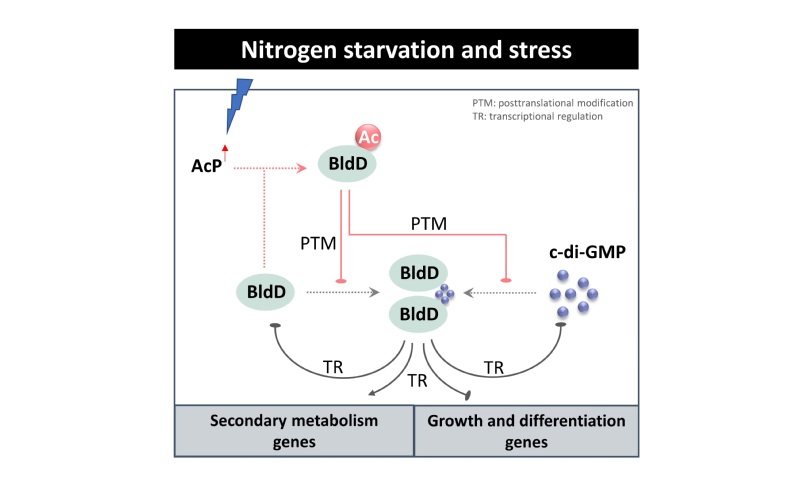 蛋白质的翻译后修饰是一种所有生命体固有的调控机制,对于调控细胞功能,决定细胞生长、发育等生命活动有序、高效进行具有重要作用。放线菌作为产抗生素种类最多、最具商用价值的微生物细胞工厂,其次级代谢产物广泛应用于医、农、畜牧业及医药研究等各个领域。放线菌次级代谢产物的产量和种类与形态分化密切相关,该过程受到营养信号与代谢波动的级联网络调控。已有的研究表明,放线菌的形态分化主要由第二信使c-di-GMP和广域调控因子BldD的互作控制,但影响该过程的上游信号及其作用机理仍然未知。解析其分子机制并精准调控放线菌的形态分化,对于全面理解放线菌生理代谢的分子基础,及以放线菌为底盘的高效合成生物系统工程化设计理论与方法研究具有重要意义。