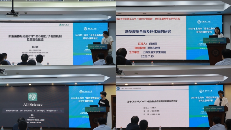 分子植物科学卓越创新中心王勇教授、江南大学刘龙教授、上海锐康生物技术研发有限公司赵华博士、华东理工大学叶邦策教授、庄英萍教授、许建和教授、赵黎明教授、赵玉政教授十位国内知名专家,为大家做精彩的学术报告。报告涉及“数字合成生物学” “Natural Product Synthetic Biology:From Bacteria to Plant” “合成生物学产业发展与智能生物制造” “科学方法论与创新思维” “风口和机遇:合成生物产业的发展趋势”、“从ChatGPT到蛋白质工程通用大模型” “细胞代谢监测示踪与生命健康”“先进分离技术与生物制造”“脂肪酸的生物炼制”和“绿色生物制造让生活更美好”。这些报告引起了师生们浓厚的学术兴趣,现场气氛十分活跃。同学们纷纷表示,本次研究生暑期学校帮助他们实现了与领域专家近距离学术交流与探讨,促使他们更加了解最新的研究动态和学科前沿。