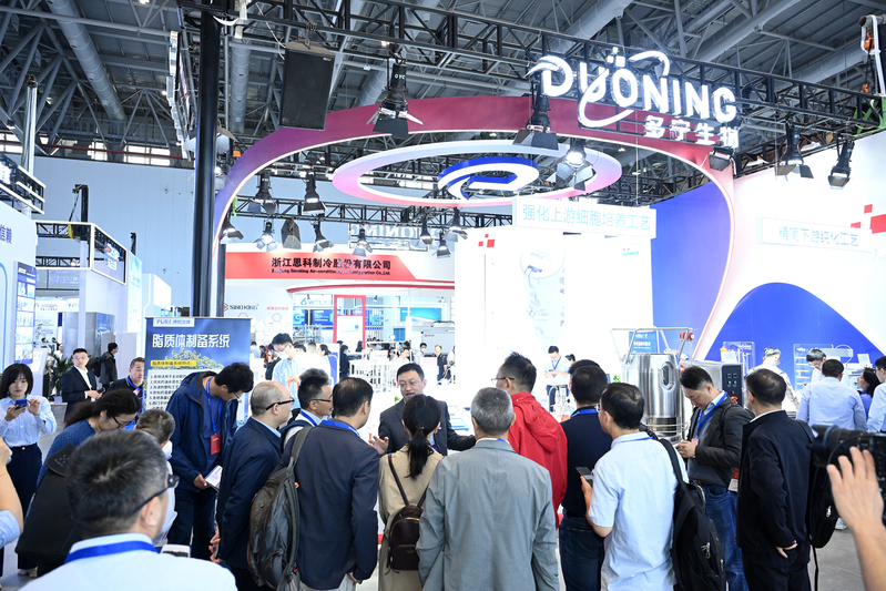 上午,参访人员在遆倩敏校友带领下,参观了由生工校友担任高管的乐纯生物、多宁生物等企业展位,了解我国制药机械领域最新技术成果和创新产品。