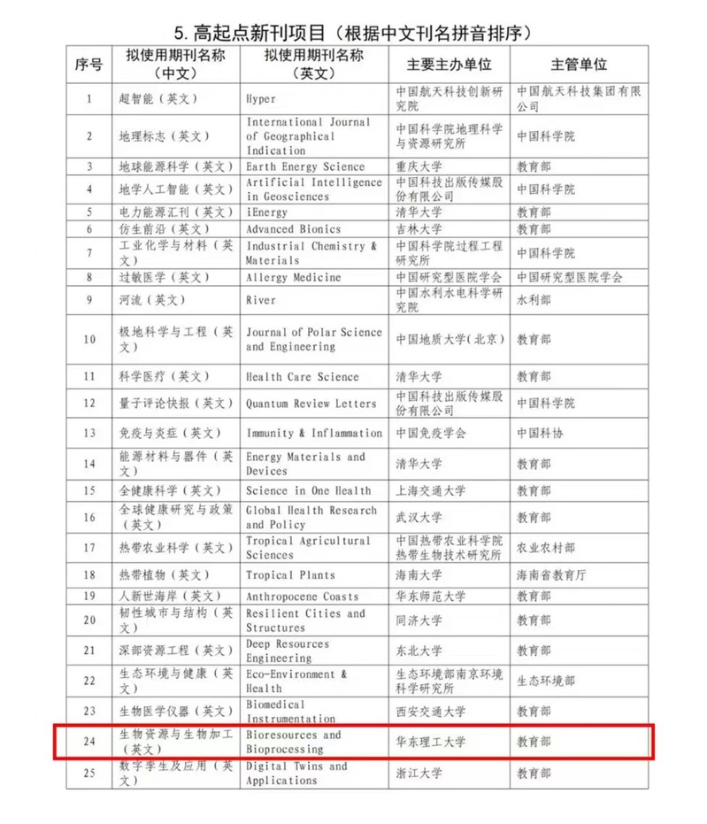 11月28日,中国科协正式公布了2024年中国科技期刊卓越行动计划二期入选项目,其中由教育部主管、华东理工大学主办的《生物资源与生物加工(英文)》(Bioresources and Bioprocessing,简称BIOB)从全国208个申报期刊中脱颖而出,成功入选高起点新刊项目。这是该刊发展过程的又一重要里程碑,彰显了国内学术界和科技出版界对其学术质量和传播影响力的高度认可,为进一步提升期刊的国际影响力奠定了坚实基础。