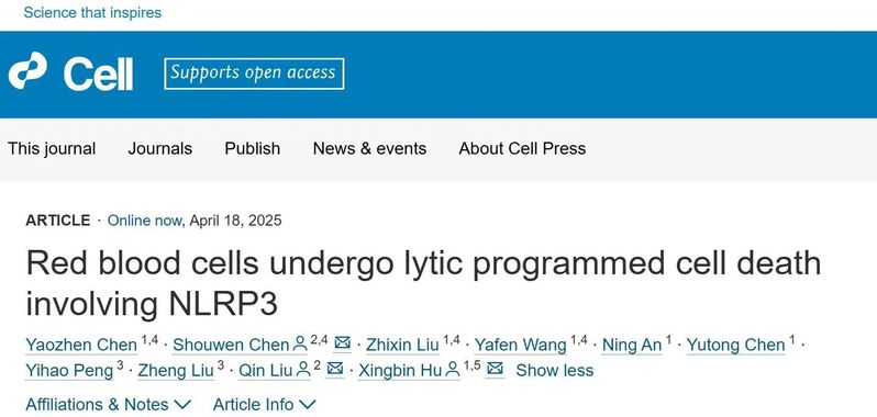 原本应该“寿终正寝”的“氧气快递员”红细胞,却纷纷意外死亡,引发的溶血性疾病,轻则导致疲劳、贫血,重则引发器官衰竭,原因何在?针对这一问题,华东理工大学刘琴教授团队联合空军军医大学附属西京医院胡兴斌副教授团队,揭示了一种红细胞程序性死亡的新机制。北京时间4月18日,国际期刊Cell(《细胞》)以“Red blood cells undergo lytic programmed cell death involving NLRP3”为题,发表了这一研究成果。